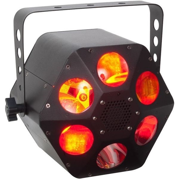 - Kraftig måneblomst-effekt med 32 W quad LED 4-i-1 (rød, grøn, blå, hvid), der producerer LED-stråler med skiftende farver